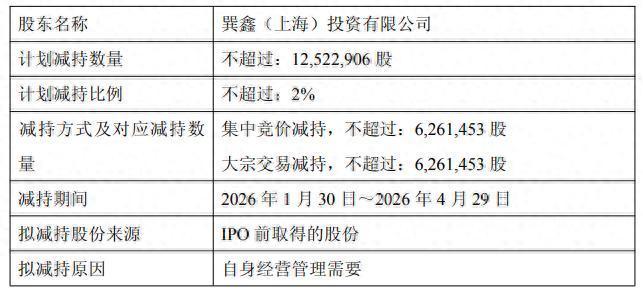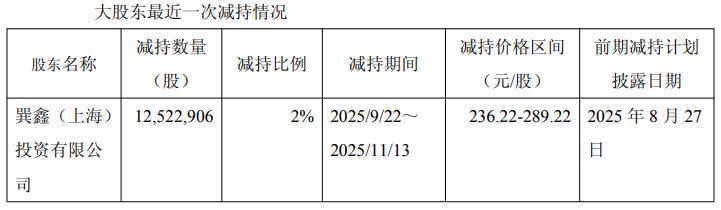 值得注意的是,这已是巽鑫投资近半年内的第二次减持,此前其在2025年9月至11月期间减持12,522,906股股份(减持比例2%),减持价格区间为236.22元~289.22元/股,套现金额颇为可观。