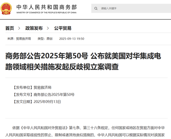 依据《中华人民共和国对外贸易法》第三十六条、第三十七条规定,商务部决定自2025年9月13日起就美国被调查措施启动反歧视调查。现将有关事项公告如下: